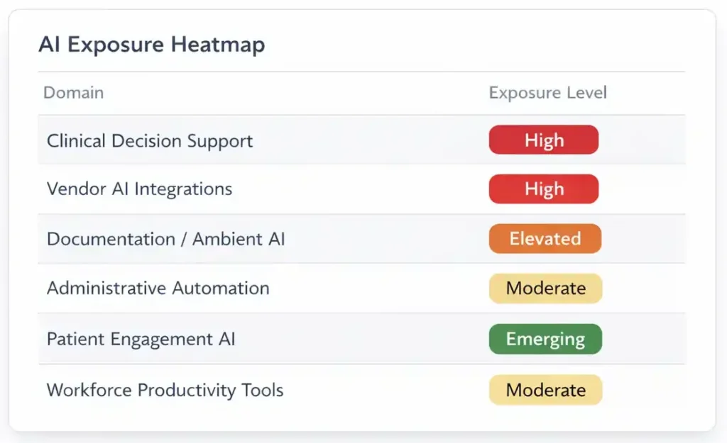 PalanQuant AI Solutions uses a structured exposure assessment to help healthcare leadership identify where artificial intelligence may already be active across the organization, whether formally approved, vendor-enabled, department-led, or informally adopted.